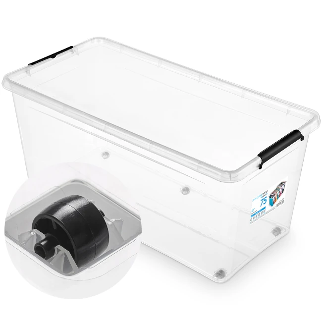 Wielkość pojemnika (75 l) umożliwia przechowywanie większej ilości artykułów, zachowując przy tym porządek i łatwą identyfikację zawartości dzięki przezroczystym ściankom. Wysokiej jakości tworzywo PP jest wolne od substancji szkodliwych, co gwarantuje bezpieczeństwo przy kontakcie z żywnością oraz mrożonych produktach. Dzięki stabilnej i przemyślanej konstrukcji, pojemnik może być umieszczony w różnych miejscach, nie tracąc przy tym na funkcjonalności. Solidna pokrywa z klipsami chroni zawartość przed kurzem, wilgocią i przypadkowym rozsypaniem.