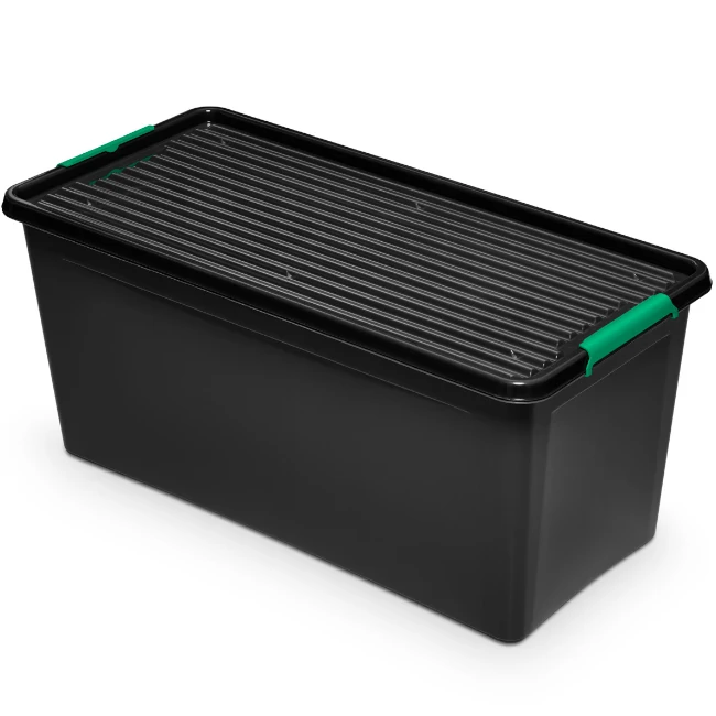 Pojemnik wyposażony jest w przezroczystą, dymioną pokrywkę z karbowaniem, która dodaje nowoczesnego wyglądu i ułatwia identyfikację zawartości. Zielone klipsy zapewniają bezpieczne i szczelne zamknięcie, chroniąc przechowywane przedmioty przed kurzem i wilgocią. To praktyczne rozwiązanie, które zwiększa funkcjonalność pojemnika i dba o bezpieczeństwo przechowywanych rzeczy. Dzięki temu masz pewność, że Twoje przedmioty są dobrze zabezpieczone. Estetyczny design sprawia, że pojemnik prezentuje się atrakcyjnie w każdym otoczeniu.