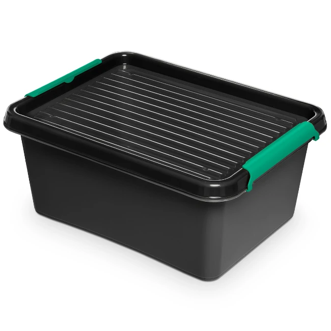 Pojemnik wyposażony jest w przezroczystą, dymioną pokrywkę z karbowaniem, która dodaje nowoczesnego wyglądu i ułatwia identyfikację zawartości. Zielone klipsy zapewniają bezpieczne i szczelne zamknięcie, chroniąc przechowywane przedmioty przed kurzem i wilgocią. To praktyczne rozwiązanie, które zwiększa funkcjonalność pojemnika i dba o bezpieczeństwo przechowywanych rzeczy. Dzięki temu masz pewność, że Twoje przedmioty są dobrze zabezpieczone. Estetyczny design sprawia, że pojemnik prezentuje się atrakcyjnie w każdym otoczeniu.